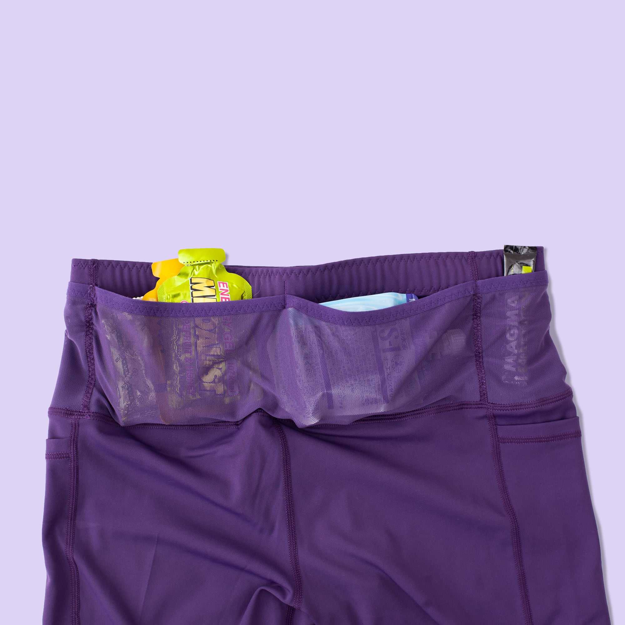 ウエストまわりにはメッシュポケットをぐるりと配置し、ジェルやソフトフラスクなどの補給を収納できます。リュックを持たないランにも便利です。両サイドには深めのポケットがあり、スマホやウインドシェルも入れられます。左サイドには反射素材の7trailsラジオ練ロゴを配置し、夜間走行時の視認性を高めています。